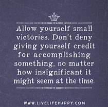 And in the grip of perfectionism, you can’t take a step back and actually see that you’ve accomplished things. Also, giving yourself credit for doing things is different than boasting. The focus should be on how far you’ve come and not on how far you think you have to go. It is OK to take some pride in what you’ve accomplished. (Now say it like you believe it!)
