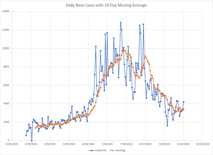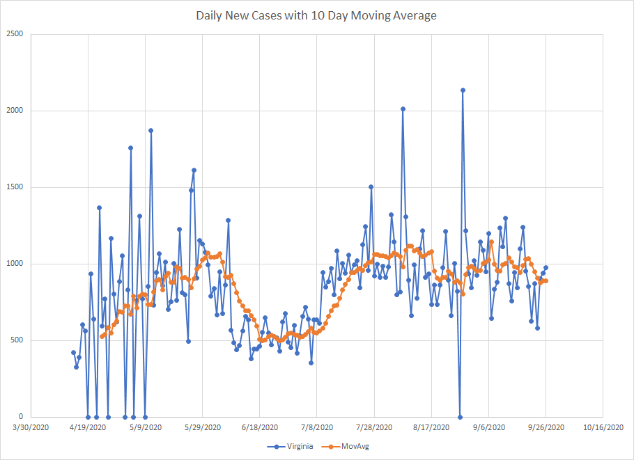 Virginia showed improvement in the numbers but I think that’s more an artifact of looking at one particular day. The case count is still high relative to peak but it has been flat since late July. This is another inconsistency of the virus because you get places with a long plateau like this. Currently, in terms of cases per people, Virginia ranks 33rd which suggests we could see this flat line extend for a bit. (Based on my assumption that you have to hit a certain amount of cases in order for this thing to burn out)