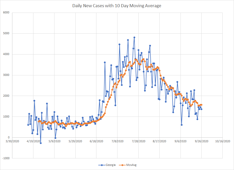 As for Georgia, here’s the graph. Down about half from the peak and you start to see some lower lows in the noise. In terms of cases per population, Georgia now ranks 6th in the country so wouldn’t expect things to start up again.