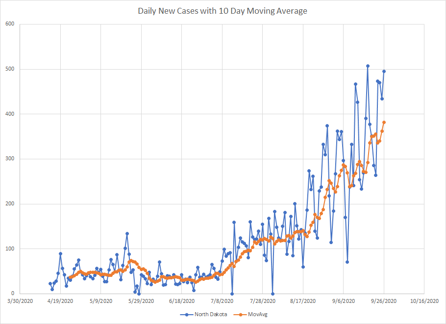 As a bonus, here is the latest graph for North Dakota. One of the things I do is try to predict a week in advance. When my prediction is consistently lower than the actual number, it indicates a place where things are still going up. As things start to flatten, the predictions becomes more accurate. That is the case for North Dakota. It is not yet reflected in the 10 day average but it looks like the acceleration phase is over and we should see this plateau. Since North Dakota currently ranks 11th in terms of cases per population, I would expect to see this start to drop fairly soon.