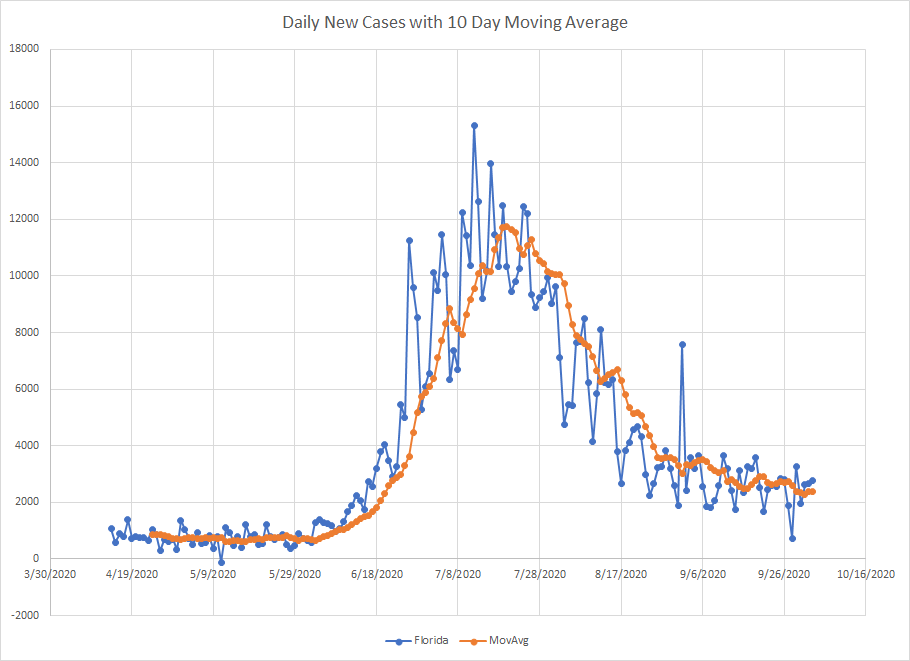 Most of these have been discussed a lot in previous posts. Here is a graph for Florida which I think just missed out on the first group last week. Like California, the raw number of new cases is still large but relative to the peak and relative to the population, it is small. Also, you can see that the moving average line is essentially flat so the growth in new cases is small.