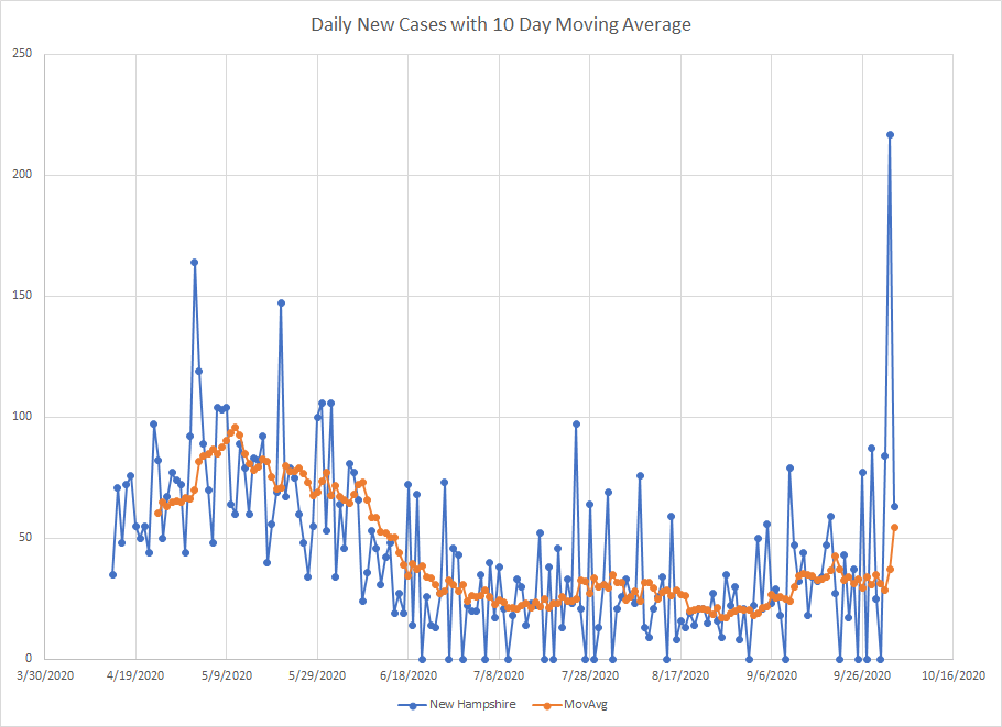 On the other side, New Hampshire had a one day spike of cases that I didn’t find an explanation for. The graph is shown below. It drew the average up and makes it seem like cases are starting to climb. New Hampshire won’t get back to normal until that day drops out of the averages.