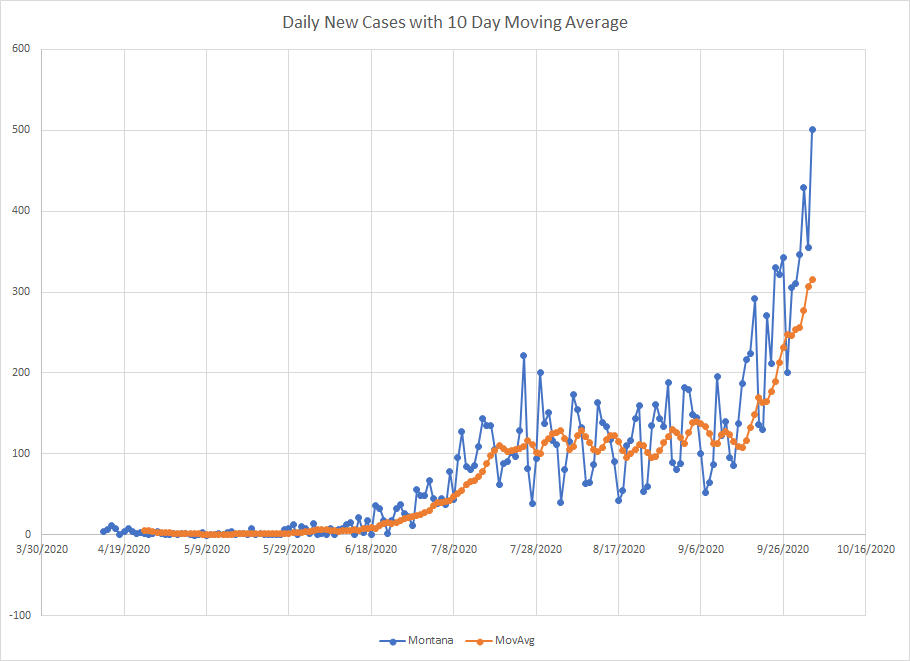 Here’s the picture to show you what that looks like. The number of new cases grew by 20% week over week which is the highest in the nation (Wyoming was next with 16%). This is the same exponential growth patter we saw in Hawaii and North Dakota earlier. If past trends are predictive, this will continue for a bit. Montana really wasn’t impacted until sometime in June so they may be the last to the party.