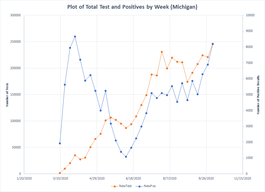If you want a counter example, here is what Montana looks like. Some of what we were seeing in September was related to increased testing but, in this last week, the blue line crossed over the orange line showing a large increase in the percentage of positive results. There was a previous spike in testing that found less than 1000 positives. In the last week, the number was over 4000. This is why Montana is last on the list.