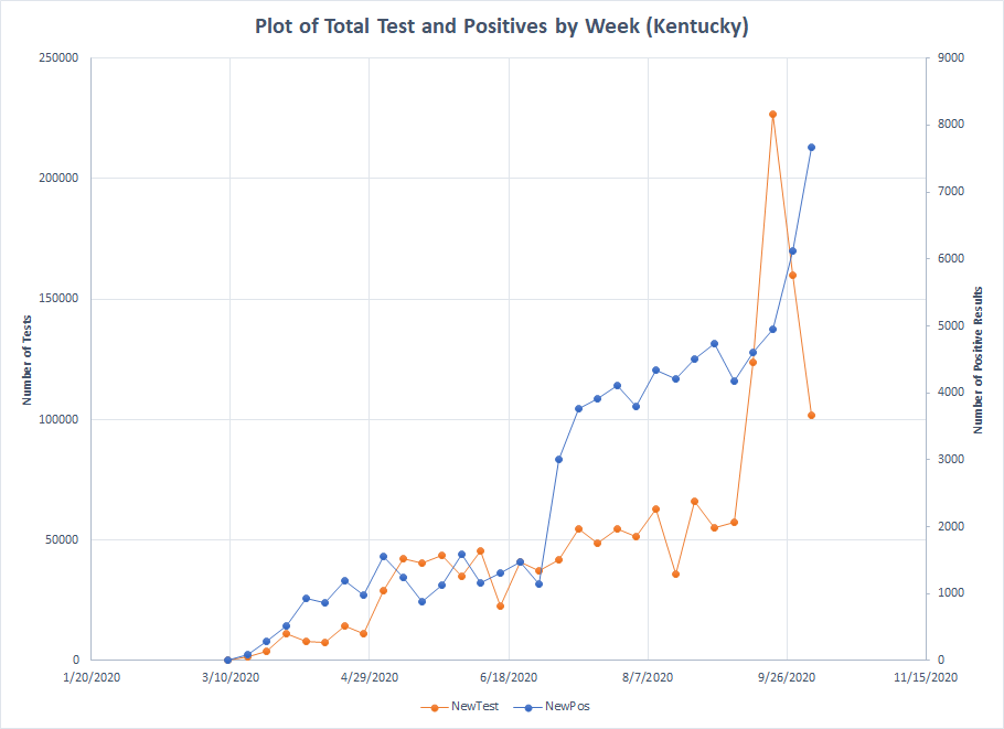 The last state on this list is Kentucky and the pattern here is just odd. Over the last eight weeks, the percentage of positive results has been 11.7%, 6.8%, 8.6%, 7.3%, 3.7%, 2.2%, 3.8% and 7.6%. Is it possible that Kentucky saw a real decline and has now bounced back up again. Possible but it doesn’t fit the type of patterns we see elsewhere. When you aggregate testing data over a whole state, you have to assume that there aren’t any underlying skews in the data which may not be the case. Was the spike in testing primarily from one location where the prevalence is lower or from a patient collective where it is lower? Things like that that you can’t know unless you can break the data down into fine chunks. It wasn’t possible to do that from the top line summaries I had. But the data from last week isn’t really different from the data back in August – just more tests leading to more positives.