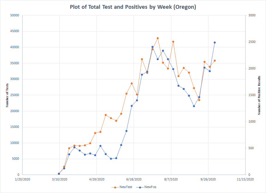 Going to take a little time to explain this graph. What you see plotted are the reported weekly totals for tests and positive results. The date represents the start of the week so the last data point is for the week that ran from October 5th through October 11th. To make the graph readable, I’ve used different scales – the left axis is the scale for the number of tests and the right axis is the scale for number of positive results.