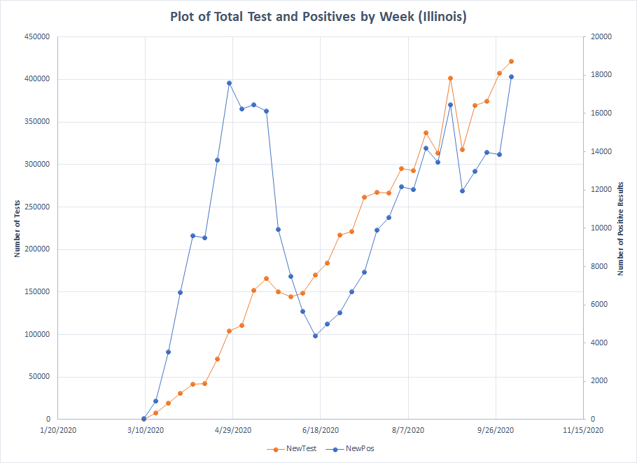 I won’t do all of those graphs. I’ll just pick a couple of examples. First, here is Illinois. Both testing and positives have been on a steady increase since mid June but the two lines have remained mostly parallel indicating no big increase in the percentage of positives.