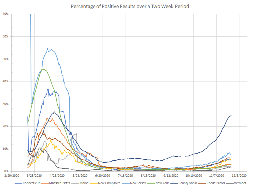 Now we get to the West Coast. Washington is a little misleading because they’ve only reported positive results for the last couple of days which is why the percentage of positive results is going almost vertical. I read that they are going to shut down reporting until December 1 so who know what their graph will look like. The glitch with Alaska in my other post was fixed but their data still jumps around a lot. Hawaii is clearly flat to down but the other states are trending up. Oregon and Arizona look to be the worst in terms of the growth rate. But we know that sometimes things start slow and then ramp up so we have to watch California.