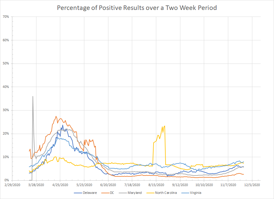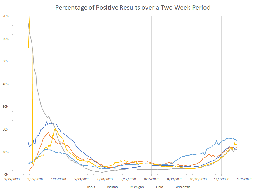 What I’ve done is just a rolling two week summary of the total percentage of test results that were positive. Unlike my other graphs, I’ve set the dates up differently so each point is a summary of the previous two weeks. Sorry for the confusion but I can never do things the same way twice. The data is current to yesterday. I’ve got the spreadsheet set up in a way that it may be easier to update but we’ll have to see about that.