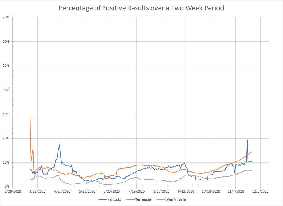 Now this one is a bit more interesting. We get some unexplained spikes in Kentucky but it looks to be flat along with West Virginia. Tennessee seems to be the exception with positive cases on the rise although it does not look like a typical exponential increase.