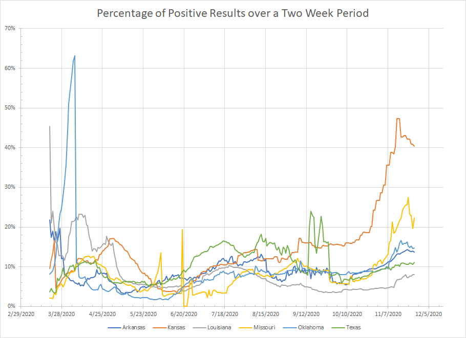 We get a similar story with this next group. The rapid climb in Kansas and Missouri had potentially started to reverse. Oklahoma and Arkansas are also trending down. Texas and Louisiana are trending up but the rate of increase is still small.