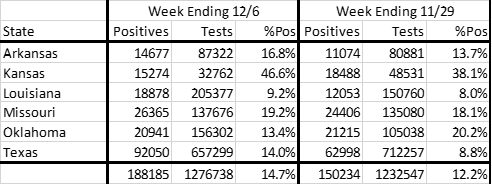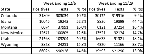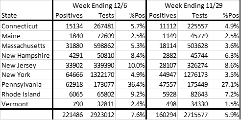 The overview for the week ending on 12/5 is that we again set an all time records for tests (12.5 million), positive results (1.3 million) and negative results (9.1 million). The numbers don’t add up for reasons – states report things inconsistently and some don’t report negative results. The percentage of positive results was 10.4% which is a new local high. So we wait and see what this week holds.