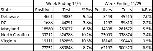 Now I realize that I wrote something before Thanksgiving expecting to see the numbers increase. That’s true but what I would have expected is a bump in testing without an increase in the percentage of results that were positive. But I would not overreact to a single week over week change. It is an area of concern that we saw increases in a lot of big states. And it could be that this wave is moving out of the upper Midwest and Rockies and back into the rest of the country. At this point, I’m not going to predict one way or the other – we need to see if this trend continues this week.