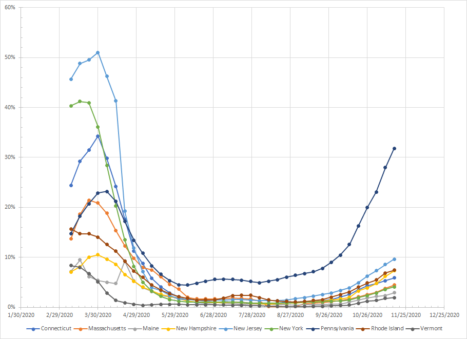 General theme is a lot of states have seen acceleration in these last two weeks. Pennsylvania remains the most problematic followed by New Hampshire. Just based on sheer numbers, New York is also on the watch list.