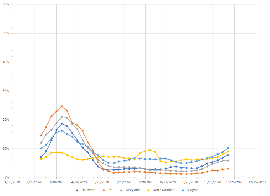 - Delaware – Cases continue to go up as this is the seventh straight week of increases. Percentage of positives also continues to climb. No sign of slowing yet.