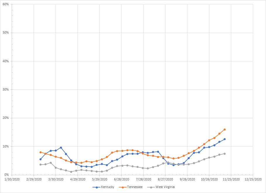 - Tennessee – Big jumps in cases and percentage of positives last week. Looks like things are accelerating there.