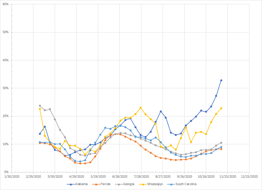 In this region, things looked relatively stable until two weeks ago where we saw jumps in several places. Alabama looks to be the most problematic while Florida may be in the best shape.