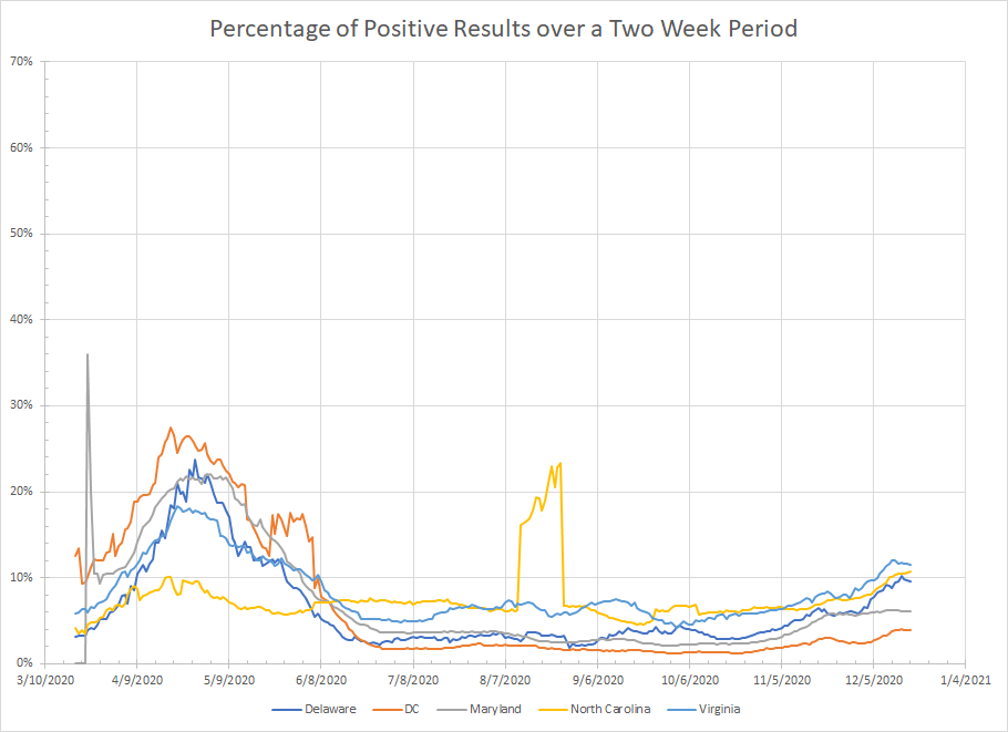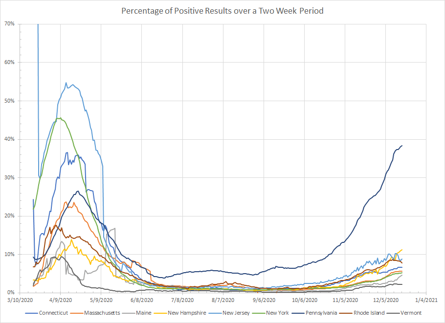 - Connecticut – One of the places that doesn’t report over the weekend so my two week sum currently has two weekends in it. The most recent high in new cases was back on 12/7 and the percentage of positive results has stalled at 6.6% for the last four days in a row. Short term trend is that things are flattening here.