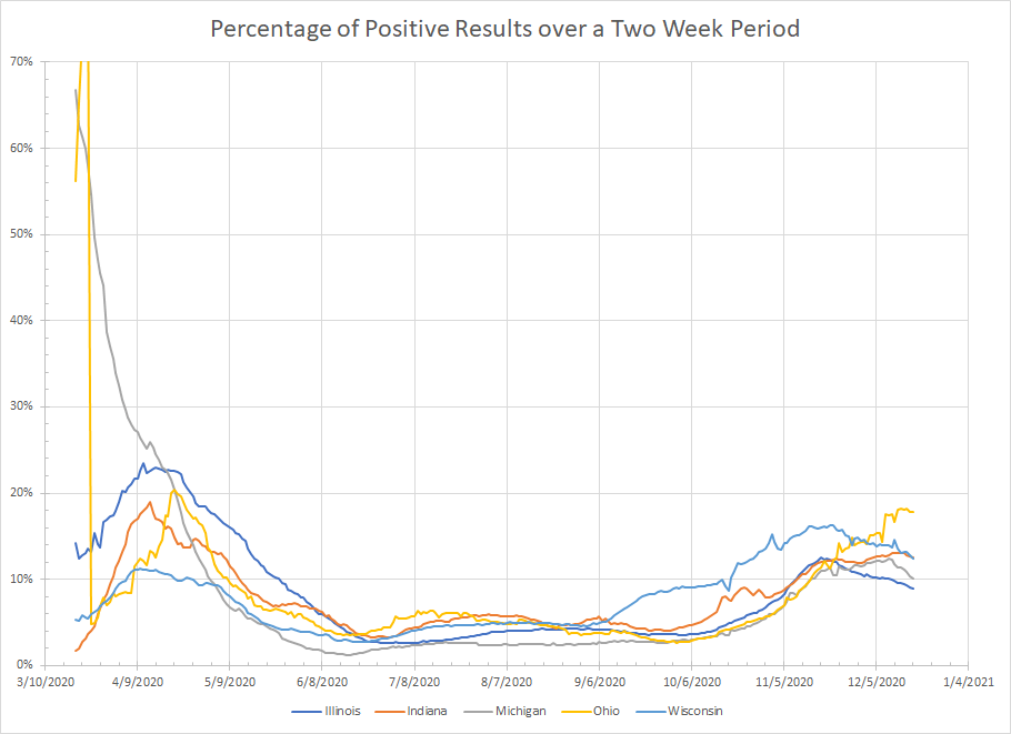 - Michigan – Similar to Illinois. The sum of newly reported cases for the last two weeks was the lowest since November 13th and the story is similar for percentage of positive results. Short term trend is that cases are still declining.