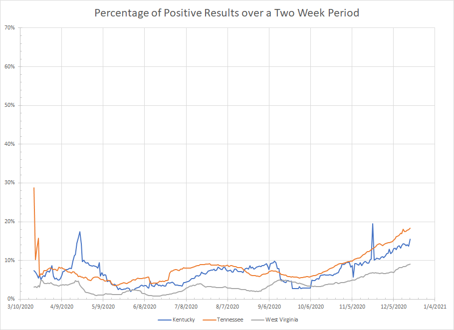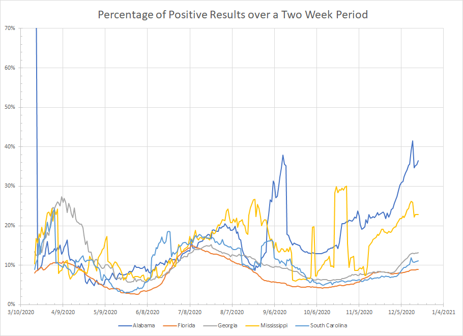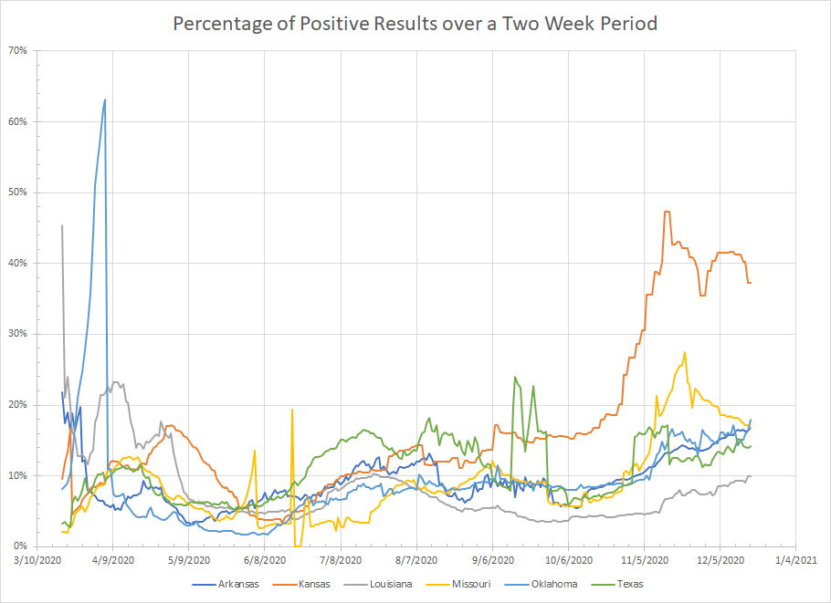 - Oklahoma – Lots of variability here. They also do inconsistent reporting of negative results which messes up the percentage of positive results. Still, both figures yesterday were new highs for December and so the short term trend has to be increasing.