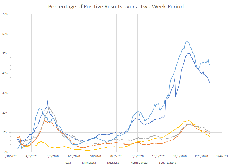 - Iowa – The sum of newly reported cases for the last two weeks was the lowest since late October and the percentage of positive results continues to decline as well. The decline is slower than the increase but that tends to be the case every time there is a surge.