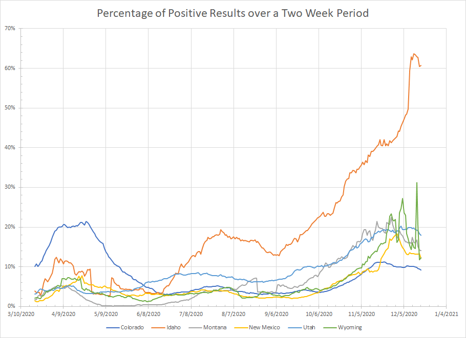 - Utah – Hit a high of 4004 newly reported cases on the 2nd although things have not dropped off that fast. Still, the sum of newly reported cases for the last two weeks has the lowest since mid November and they was at 18% positive for the last two weeks which is also the lowest since mid November. Short term trend does seem to point to further declines.