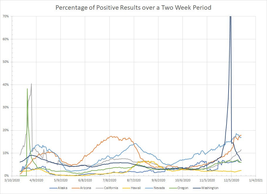 - Alaska – They hit a high for December of 922 newly reported cases on the 5th. While there have been some short term fluctuations in the sum, it has been down seven days in a row and the percentage of positives for the last two weeks was 6% which is also lower than the previous week. So the short term trend looks to be for further decreases.
