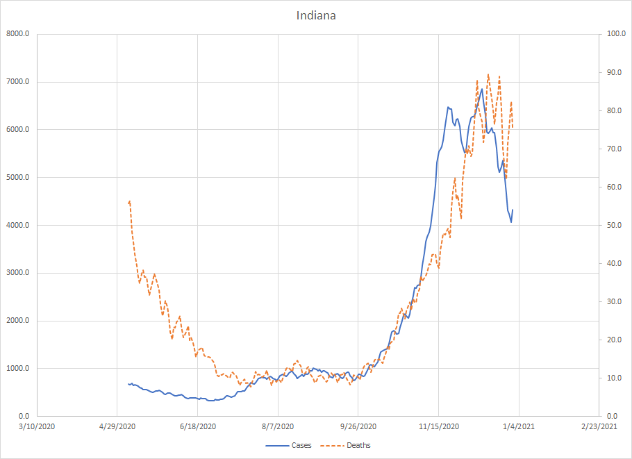 Indiana – Like Illinois, there was a peak in the spring but the cases and deaths in the fall have gone beyond what happened in the spring. The peak here was a little later occurring on December 10th. The first drop was an artifact caused by the Thanksgiving disruption the drop now is larger and probably beyond any impact of an end of year disruption.