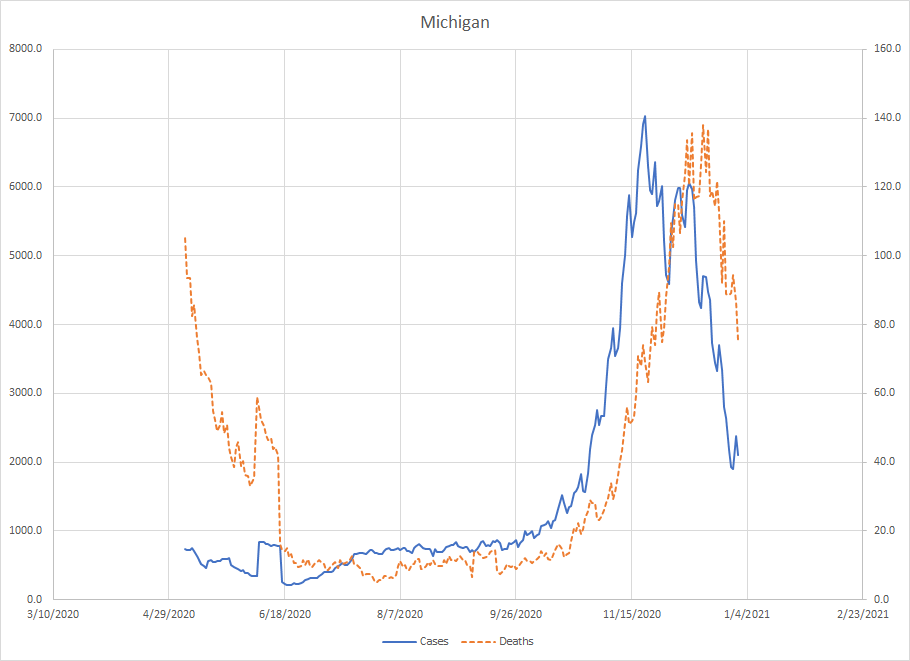 Michigan – very similar pattern to Illinois. I think in parts of the Midwest, the first wave in April was cut short and so the cases and deaths have been higher in the fall. Here, cases peaked on November 21 and have really dropped off since there. Deaths peaked a little later and are also falling. Things are improving here.