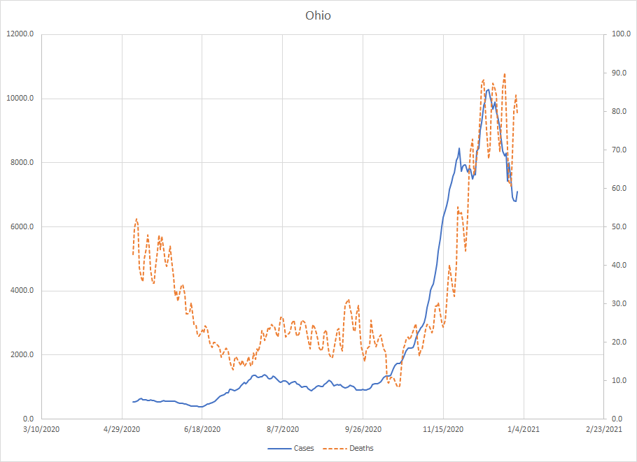 Ohio – Ohio and Indiana have similar patterns and cases here haven’t dropped off as fast as they have in Illinois and Michigan. The peak in cases was on December 16th and for deaths it was on December 23rd. Again, like Indiana, I think the recent drop off is larger than could be explained by an end of year disruption so things look to be improving here.