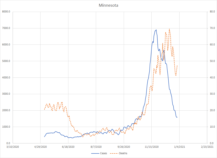 Minnesota – Had some issues in the spring but then things were basically flat until about the 17th of September when cases started to slowly rise. On October 28th, the acceleration phase kicked in and cases shot up until they peaked on November 23rd. Deaths peaked on December 17th and both have dropped off since then. Cases are way down from the peak so things are improving here.