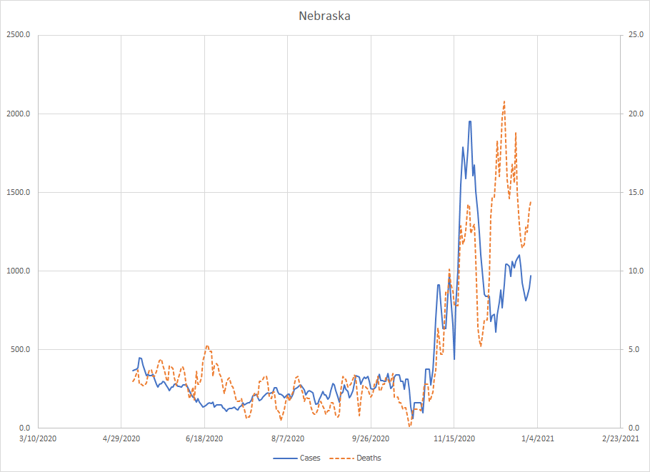 Nebraska – Kind of an odd pattern with parts similar to other states in this region. A very low level of cases and death until October 26th when things started to accelerate reaching a peak on November 25th. Cases started to drop off and are about half of what they were at peak. Deaths peaked on December 15th and have dropped. Both cases and deaths seem to have started back up again so we need to see that the drop was just a disruption in reporting. Given the magnitude, I don’t think so I’ll still say things are improving here.