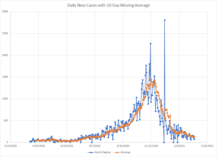 Here is the graph for North Dakota. The rate of decrease has slowed but they also have had several days recently with under 100 newly reported cases. Not bad when at peak they had several days above 1500 newly reported cases.
