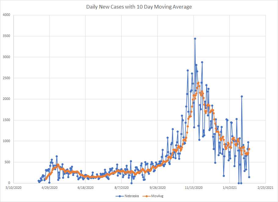 The last state in the first group is Nebraska and that graph is shown below. You can probably see that number of newly reported cases hasn’t dropped as much as it has for North Dakota and the rate of decrease has clearly slowed. But you can also see that we have three recent days with low numbers (ignore the zero’s those are gaps in the reporting)