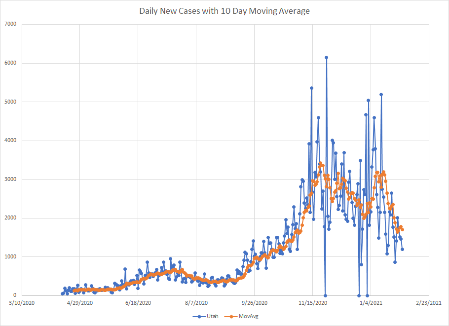 Last in this group is Utah. They’d still be in the top 20 though. In one of my previous posts, I mentioned they peaked in November but came close to that in early January. But once we hit January 15th, cases started to drop and have continued to do so. Again, they still well above summer levels but down about half from peak.