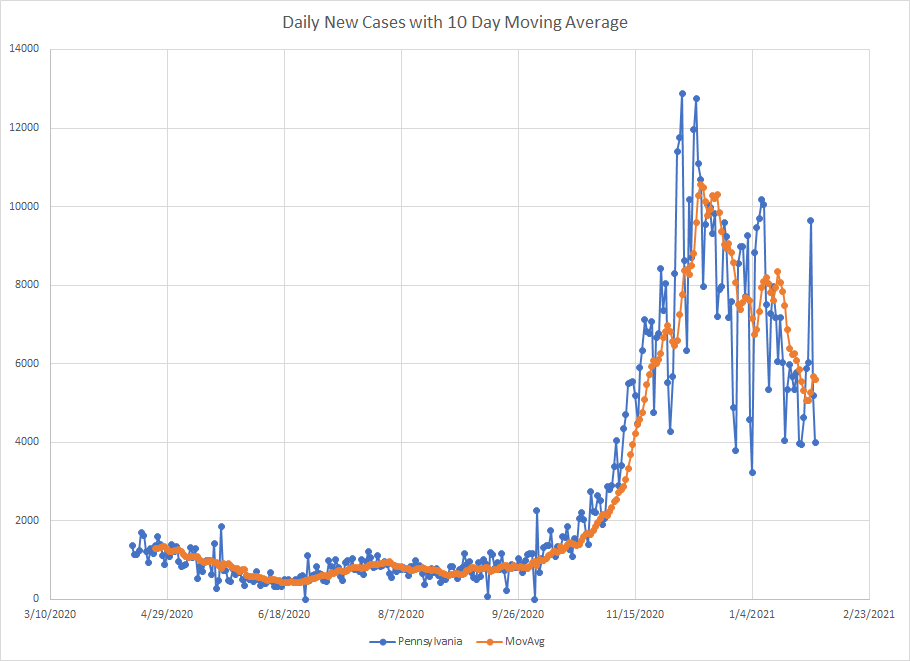 The last state in this group was Pennsylvania just north of the Mason Dixon line from Maryland. On January 29th, they reported 9643 cases which is way above the rest of the data and you can see the spike on the graph below. I didn’t see any notes about why this one day was so much higher and that one day does pull up the average. Outside of that day, things actually look good here but we need more time to make sure that was just a one off.