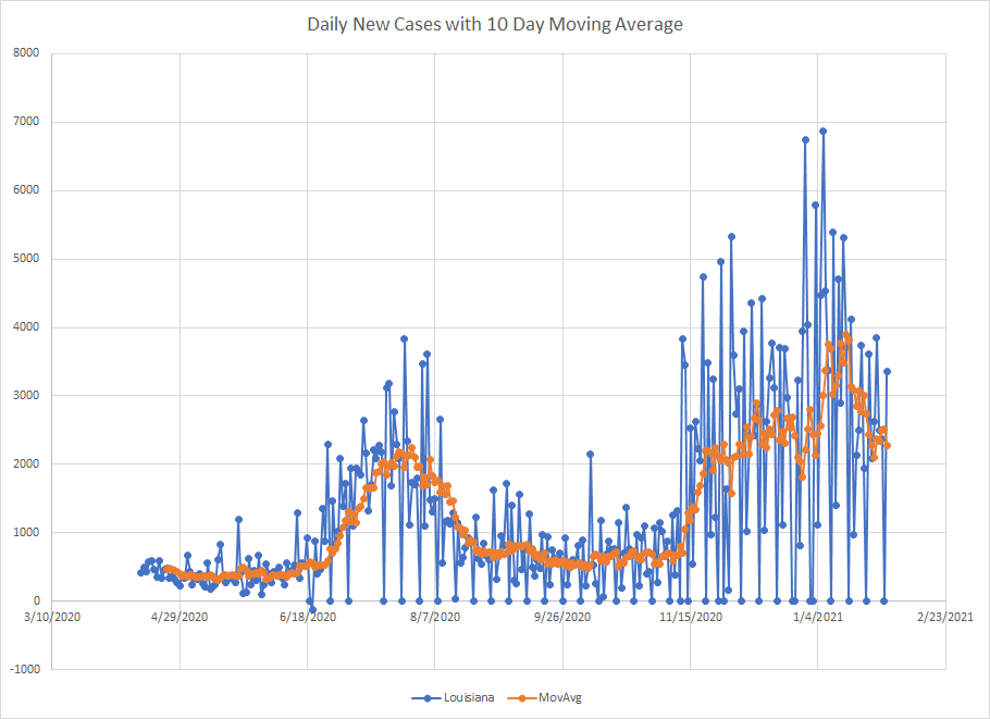 Louisiana is another state that doesn’t report on Saturdays so you get a bunch of days with zero followed by large spikes. The ten day average helps smooth this out. Louisiana was hit hard in the early spring (not shown) and then other parts spiked during the summer. The third wave in the fall/winter is a little muddled but they are off the peak from early January even though it looks like cases may be in some kind of range.