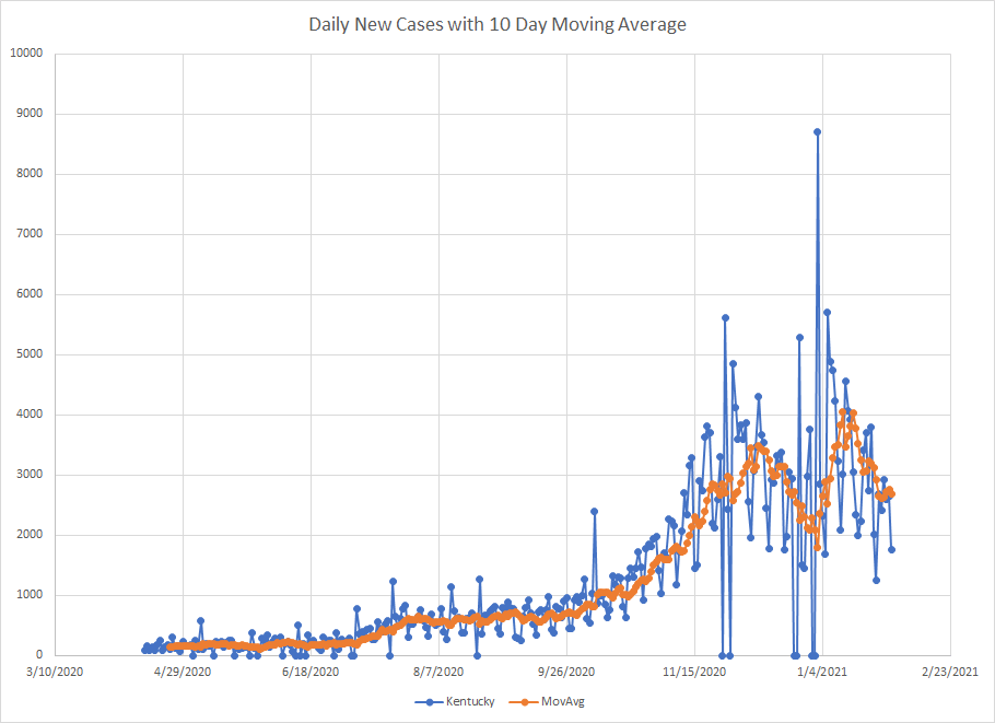 The last state in this group is Kentucky. We get the twin peaks due to the end of year disruptions where there were several days where they didn’t report anything. The large spike on January 2nd obviously contains a lot of catch up. But cases have been dropping since mid January but you can see they haven’t dropped as much as some of the states shown earlier.
