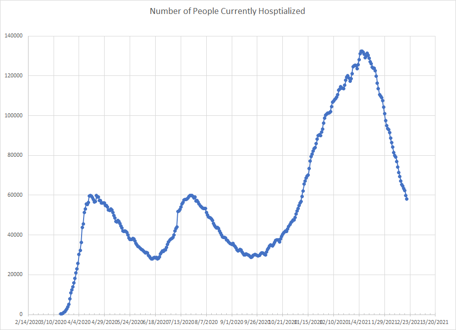 We also continue to see drops in the number of people hospitalized or in an ICU. The graph below is for hospitalizations and the slope of the drop continues to be much faster than the previous two waves. At this point, we are back to levels from the first week in November or about two weeks behind where we are with cases.