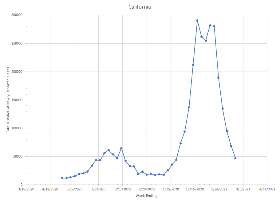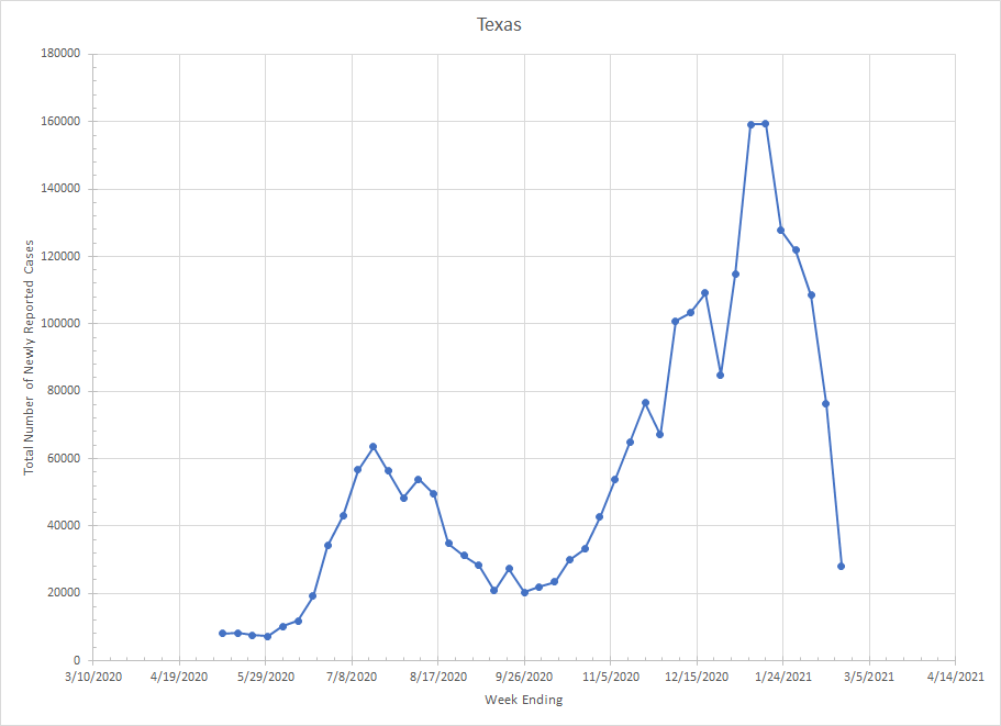 Next we have Texas. I suspect there is some disruption to the numbers from last week because of the weather and power problems. It would not be a big shock to me to see things increase a bit next week because last weeks numbers took a huge drop. Still, they are at levels less than half of what they were at peak.