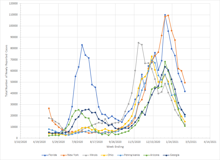 The first group of states includes Florida, New York, Illinois, Ohio, Pennsylvania, Arizona and Georgia. I don’t have data from March/April of last year so you just see the tail of the first wave for New York. Florida was part of the Sun Belt wave in the summer along with Arizona and Georgia. Illinois stands out with a peak in mid November but you’ll see others later. The symmetry of the peaks for most of the states is interesting as a group of them peaked the week of January 9th. All are dropping and have been for many weeks and all are less than half what they were at peak.