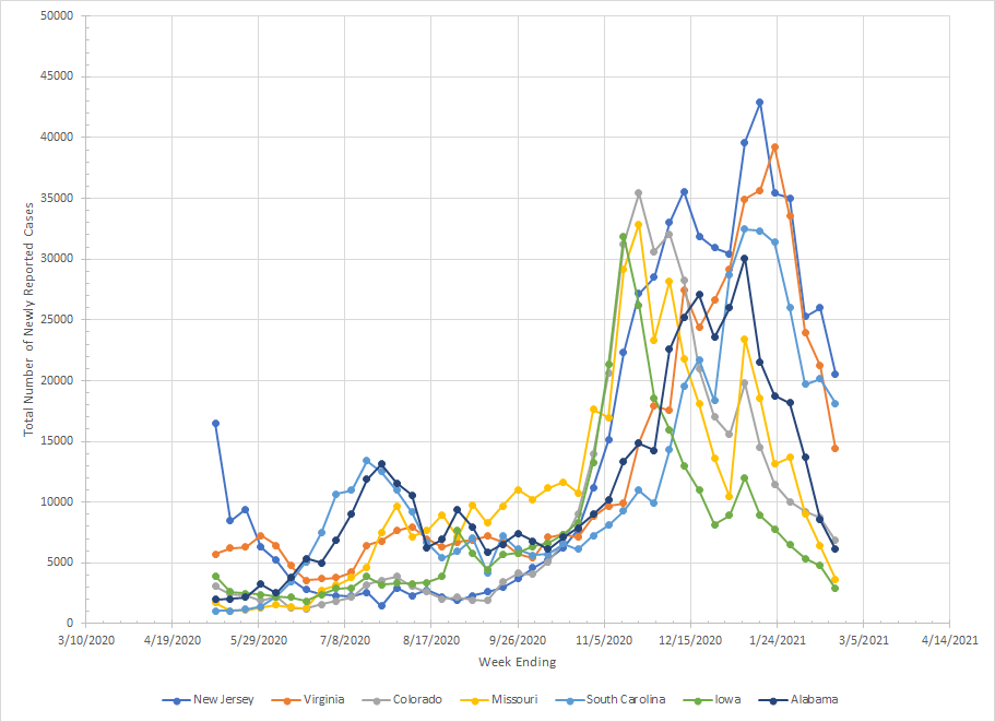 The next group contains Oregon, West Virginia, South Dakota, North Dakota, Montana, Rhode Island and New Hampshire. Oregon actually has a little rise in the summer before taking off again in the late fall. The number of cases in North Dakota actually went up last week but I think that’s because they’ve reached an equilibrium and they’ll probably bounce around those numbers unless they decrease testing. The Dakotas and Montana are similar with all being early states in the third wave. New Hampshire has an interesting graph as things didn’t really get started there until early November and they remained near their peak value for seven weeks before cases started to drop.