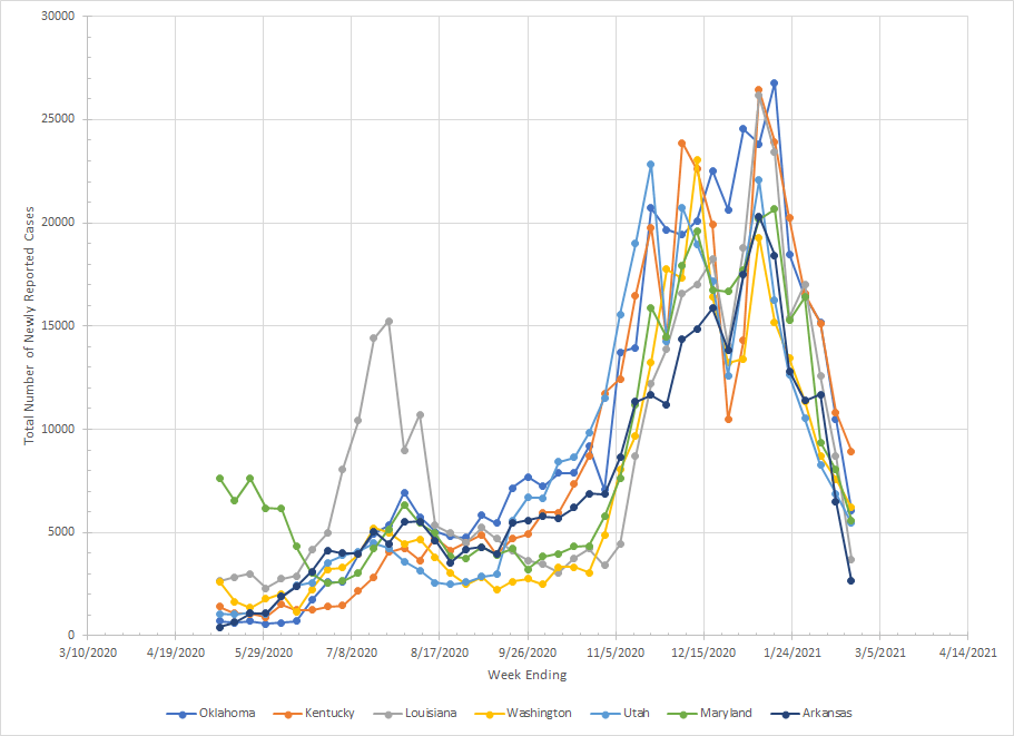 Moving on to the next group which has Oklahoma, Kentucky, Louisiana, Washington, Utah, Maryland and Arkansas. Maryland was hit in the first wave and Louisiana in the second but the rest don’t really show up until the third. Washington did have some early problem but my data doesn’t go that far back. It is interesting that from late September to early November, those three states lagged behind the rest which had started to increase. As a group, all have been dropping quite fast since early January.
