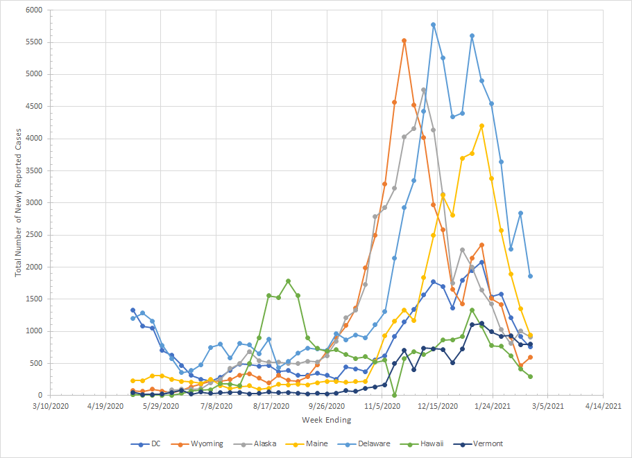 The last group has DC, Wyoming, Alaska, Maine, Delaware, Hawaii and Vermont. Hawaii had their peak in the summer and a smaller spike in late December. Wyoming, Alaska, Delaware and Maine show the typical exponential growth phase with a peak and then a decline. DC did see an increase but it was more slow and gradual. Vermont is just off. They had a very small number of reported cases until early November but the rise has been very gradual and they are only slightly below their peak value in early January.