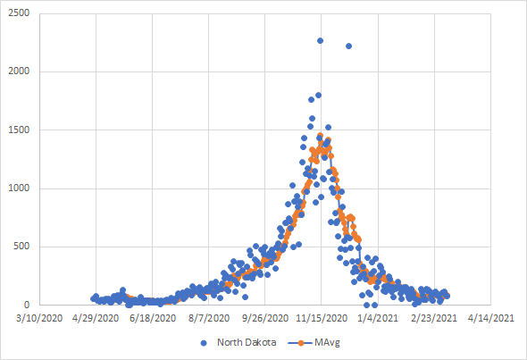 I’ll start with Colorado. The blue points are daily case counts and the orange is a ten day moving average. It gets messy at the end but you can see the orange points starting to move back up. Now, it has just moved back to mid February levels so it is still well below the peak and the weekly totals have only gone up two weeks in a row so it is hardly a trend. Still when everything else is going down, the places that aren’t stand out and need to be watched.