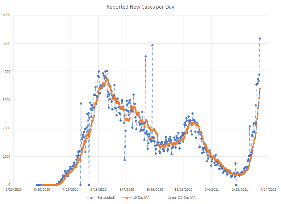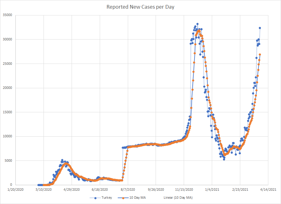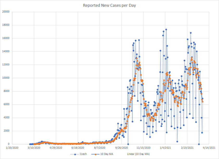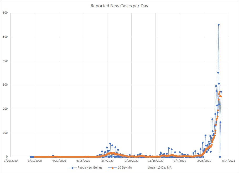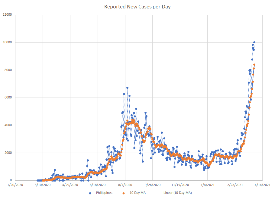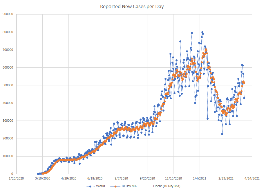 As we are near the end of March, it seemed like a good time to just do a mini recap. One of the things I’ve used from the start is a ten day moving average of cases. It works best in places where reporting is done on a regular basis. There are several countries that report less frequently like once a week or so and then the averages tend to be less useful.