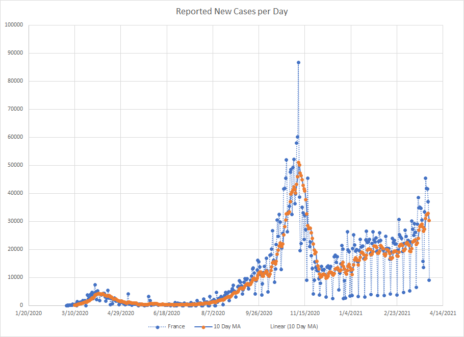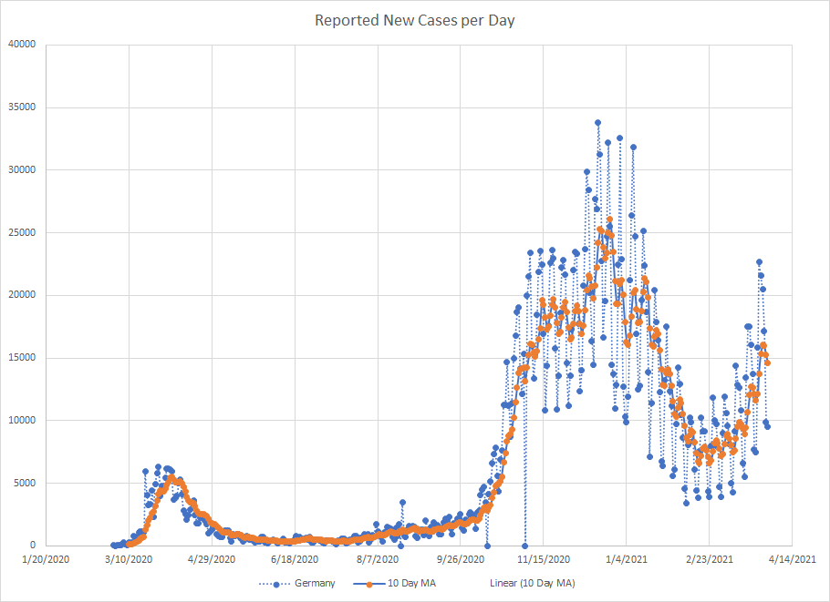 Some of what is going on here is influenced by the one super high day in mid March. But even when that fell out of the average, the results didn’t start falling until a few days after. The trend certainly appears to be downward now meaning that the last wave lasted about a month. While it is still too early to say with high confidence, most of the European countries shown above are seeing down ticks in the moving average at the end of the graph which is about a month after things started to climb. Really need to wait until mid April to know for sure if the trend is really going down.