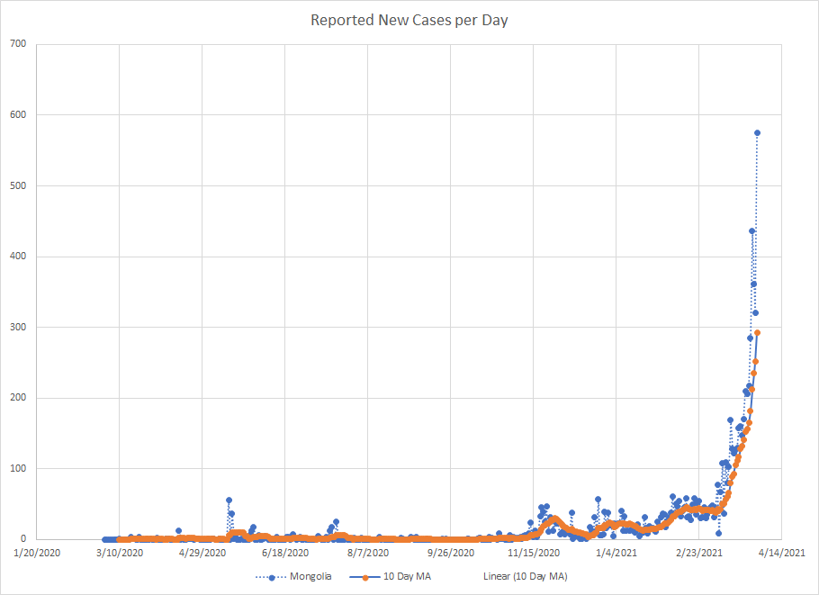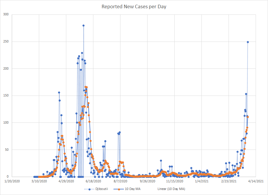Still, it might be interesting to look closer at this latest rise. As I created this database, I was only including detailed data on a country when it passed 5000 cases. That seemed like a large number back in March of last year. The WHO currently shows 222 places with at least one case of the virus. Of those, 163 have passed 5000 cases. If I look at my ten day averages, 105 places showed an increase over March and 57 showed a decrease. Tajikistan hasn’t reported a new case since January 10th so they were at 0 for all of March.