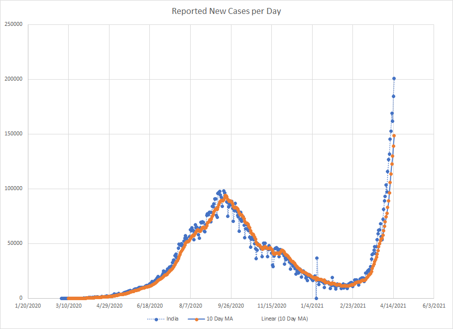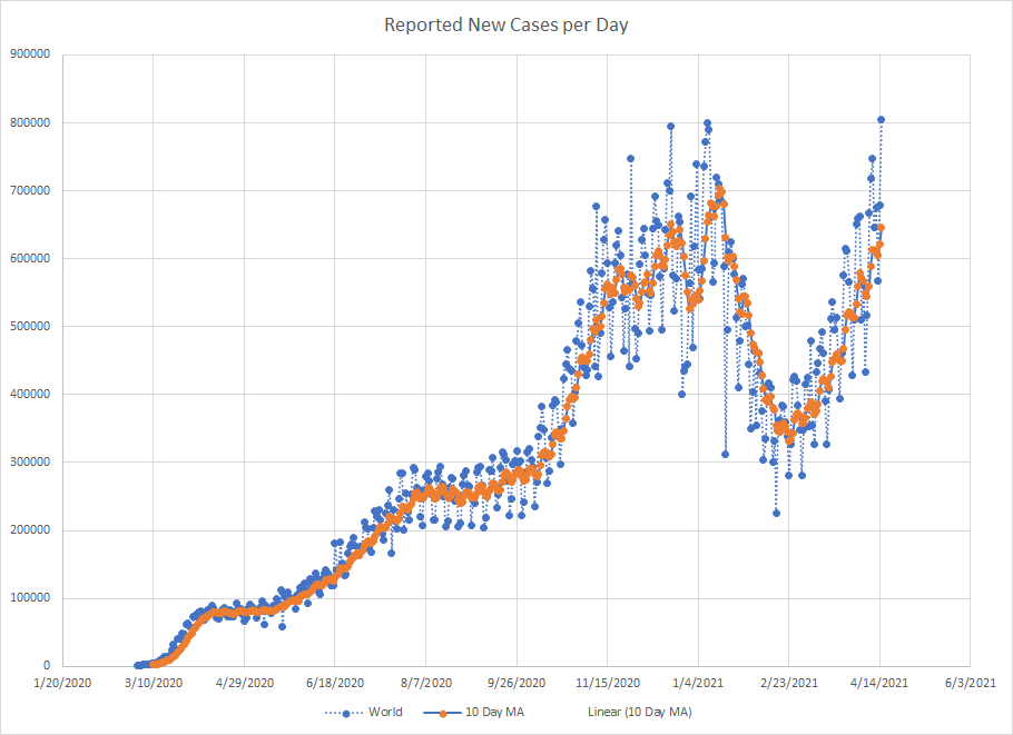 Let’s just start with a graph of worldwide cases. The blue dots are the actual reported numbers and the orange dots are a ten day moving average which hopefully smooths out some of the day to day variability in the reporting. Cases hit a low on February 23rd and have been on the rise ever since. In fact, the number of cases recorded today set an all time high.