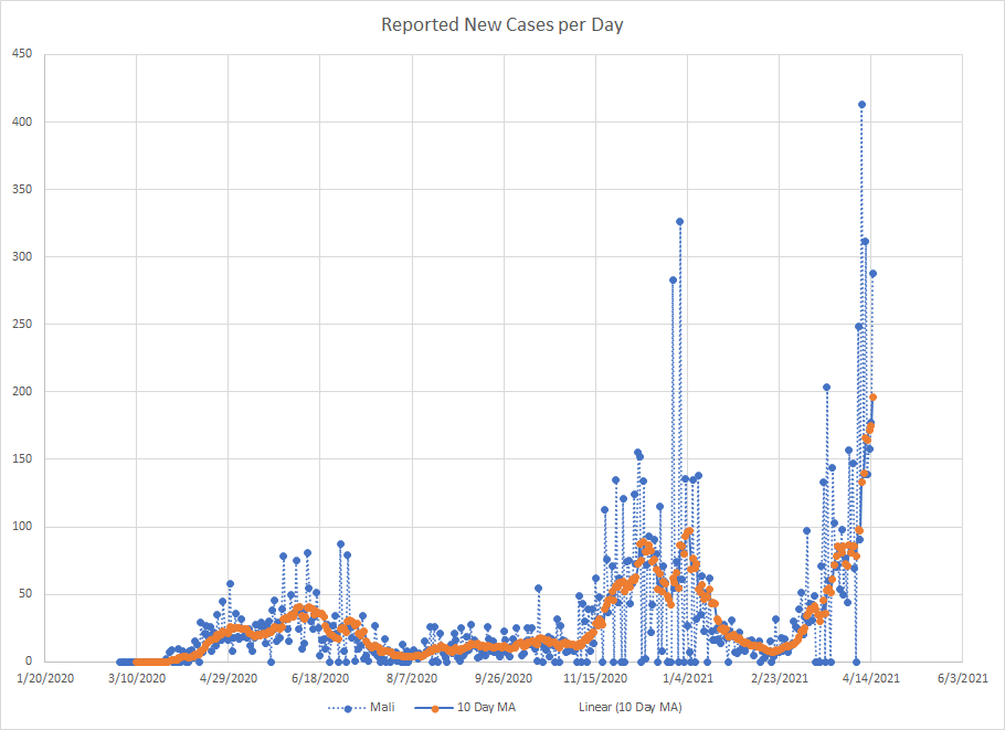 With some allowances for subjectivity, the five places with the biggest increase in cases were Ethiopia, Cameroon, Kenya, Madagascar and Mali. I’ll use Mali as the example.